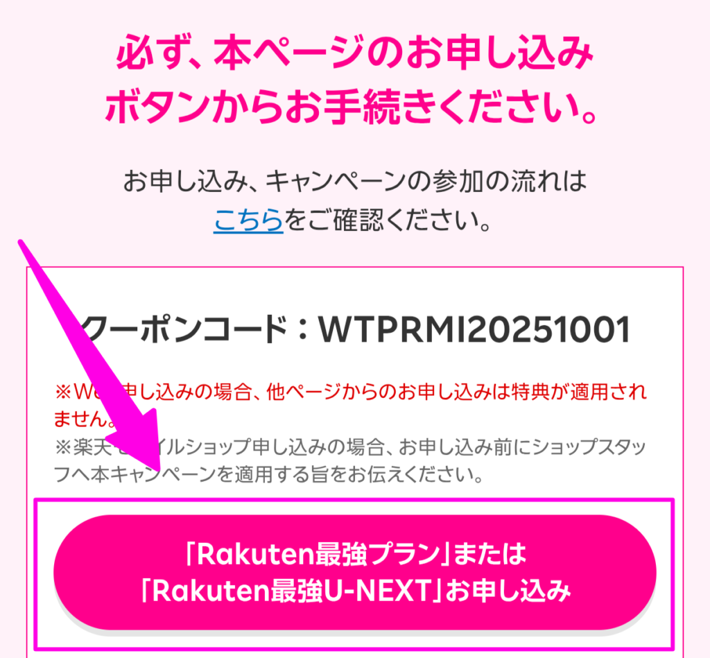 - 特設ページで「Rakuten最強プラン」または「Rakuten最強U-NEXT」へ申し込むこと