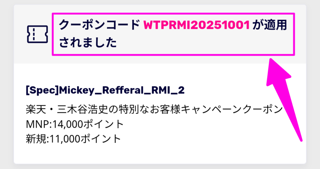 ボタンをタップすることで、クーポンコード「WTPRMI20251001」が適用されます。