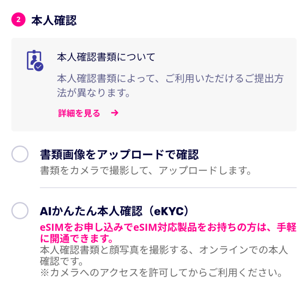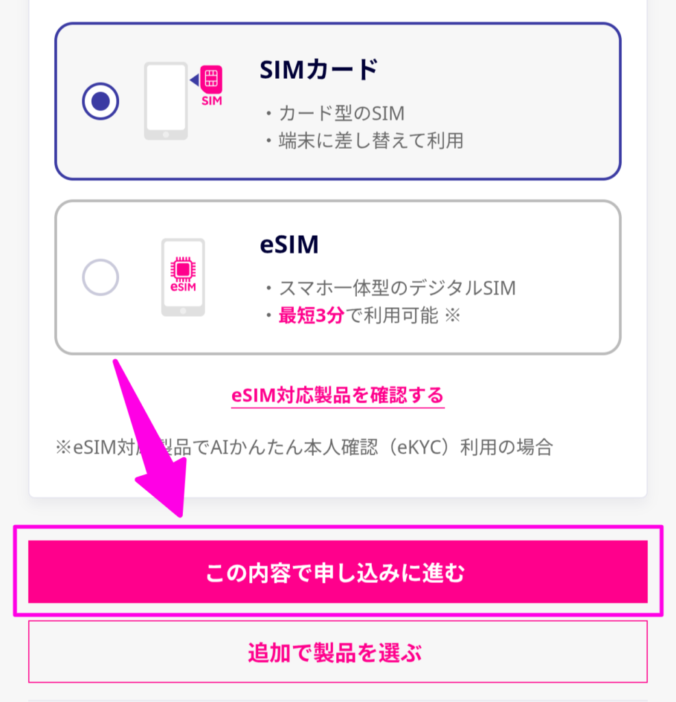 eSIMを利用する場合は「eSIM対応製品を確認する」をタップして、お使いになる端末が対応しているか確認しておきましょう。