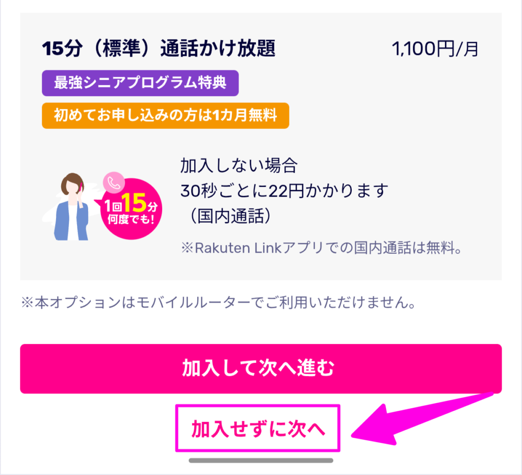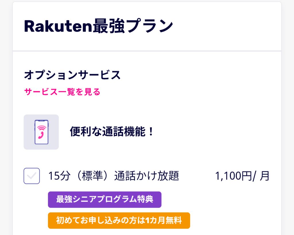 | 通話料 | 30秒22円 (Rakuten Linkアプリ利用で国内通話無料) | ||
